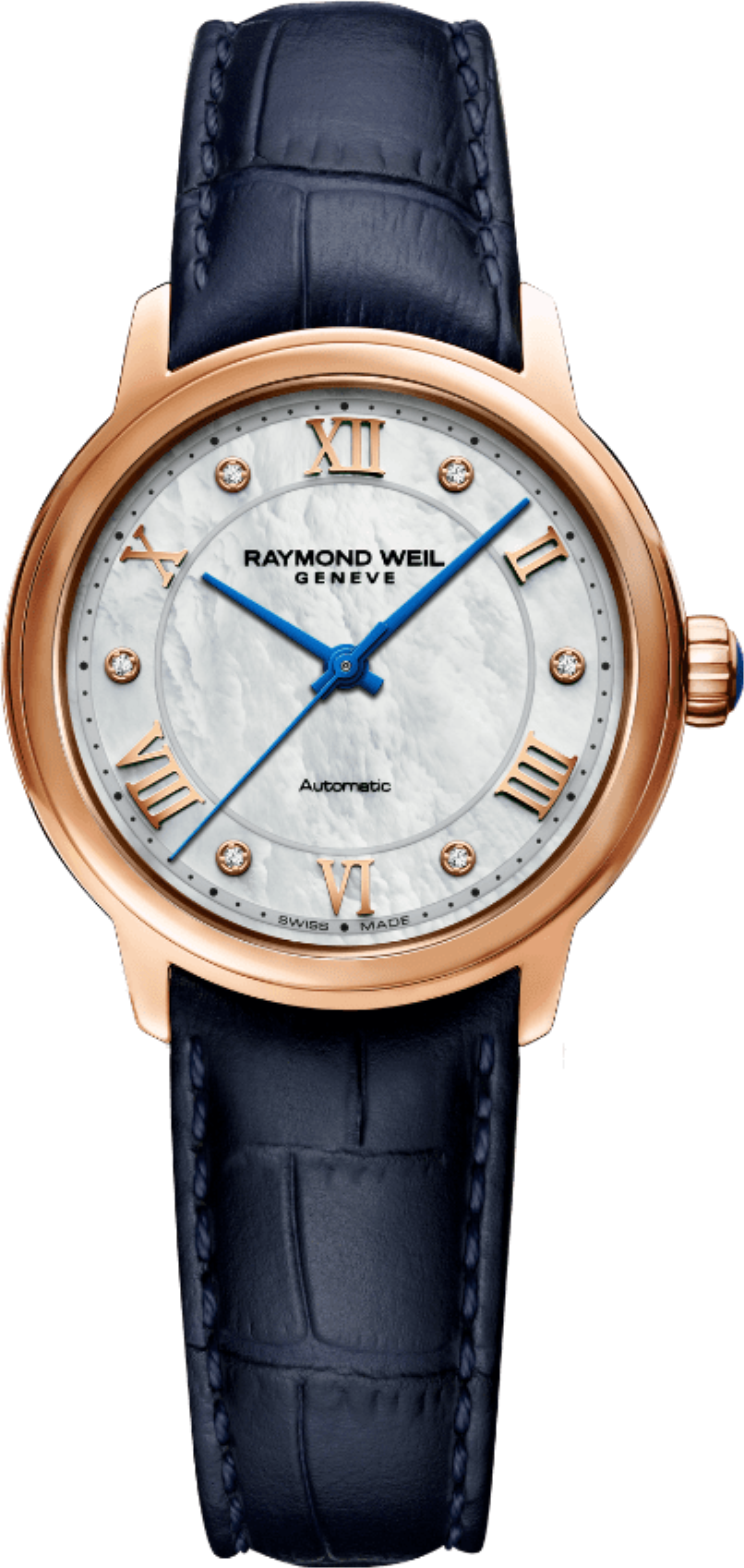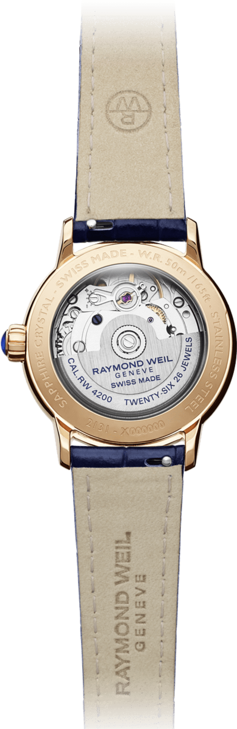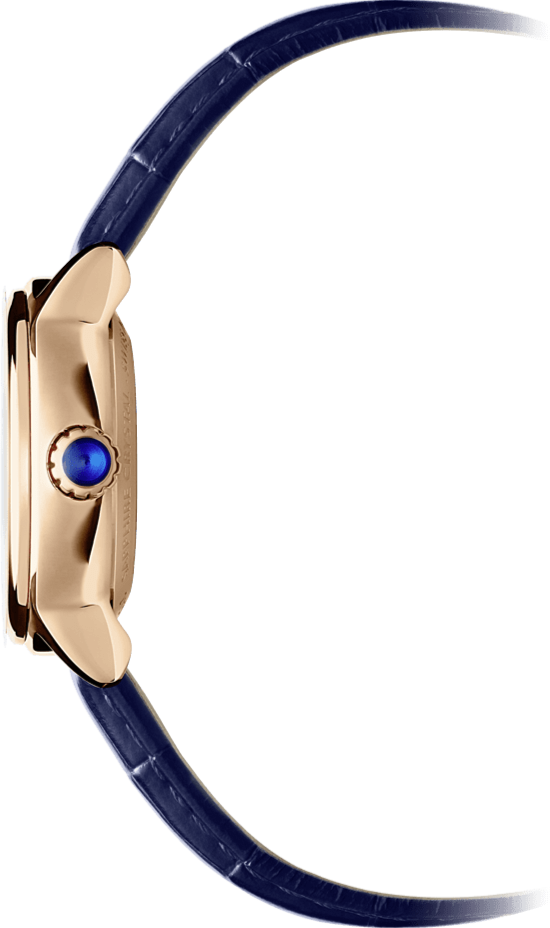 Funkce:Čas, datum, strojek Swiss ETA automatic RW 4200 = rezerva chodu 38 hodin, polokmity setrvačky 28.800/h = přesnost chodu 2 - 4 vteřiny denně, 26 kamenových uložení, zapínací skládací spona z nerezové oceli RW s PVD pokovením z růžového zlata a dvojitým bezpečnostním systémem, modrý řemínek z telecí kůže s aligátoří strukturou a modrým prošíváním, lakovaná korunka, číselník zdobí 6 diamantů 0,023 karátů (jednoduchý řez 8/8 - SI2 až SI1)